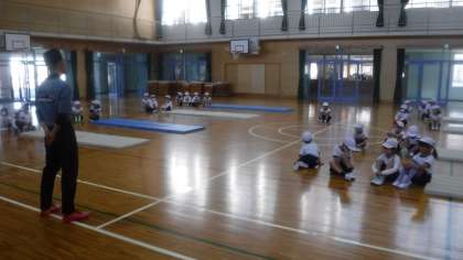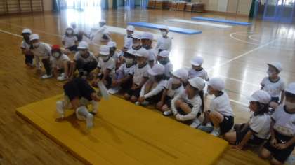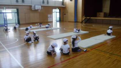 忍者になりきり,マットを使った運動遊びを学習しています。 前回り・後ろ周りにつながっていきます。