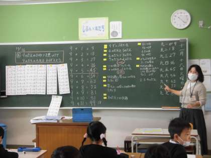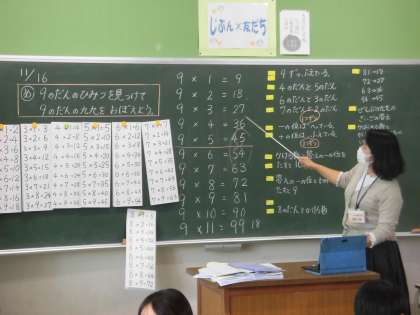 2年2組 算数 「9のだんのひみつ」 公開日 2021/11/16 更新日 2021/11/16 2年 9のだんのひみつを探りながら,九九を覚えていきます。 たくさんの気づきが出てきて,活発に発表が行われています。