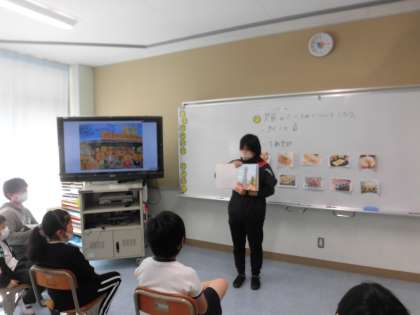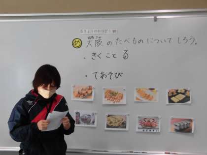 太陽学級 今日の活動 「大阪のたべもの」 公開日 2021/11/16 更新日 2021/11/16 太陽 学級 「大阪のたべものについて知ろう!」ということで,絵本から歌を歌っています。 『大阪には,う〜まいもんがいっぱいあるんやで〜♪』