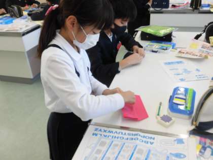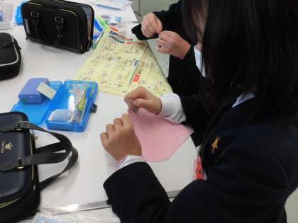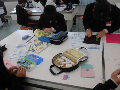 さまざまな縫い方を習いました。 集中して縫っています。 ボタンも上手につけることができていました。