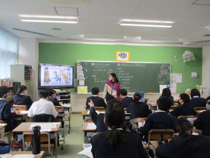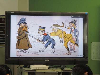 日露戦争当時の風刺画から,アジア(中国)に勢力を広げたいロシアと,それを阻みたいイギリス・アメリカの間で日本が戦争をしたことを確かめました。