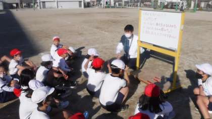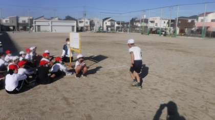 3年4組 体育 公開日 2021/12/09 更新日 2021/12/09 3年 子どもたちが前に出て実際に動いて自分の考えを表現しています。 先生は陸上経験者ということで,気合が入っています。朝早くから準備をしていました。
