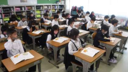 この時間は,1年生で国語を学習している学級が多かったです。 3組もお店屋さんの準備をしていました。