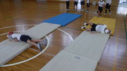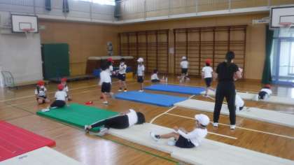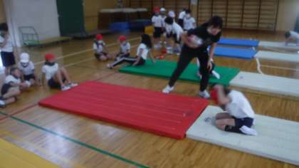 自分たちでサイコロをふり,出た技を行っています。 この学習が,中学年のマット運動につながります。