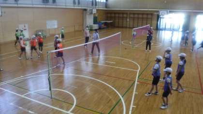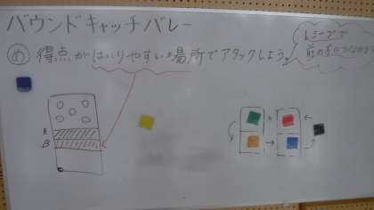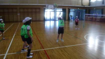 キャッチバレーボールの学習をしています。 「広がろう」などの声が出てきました。