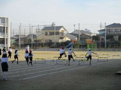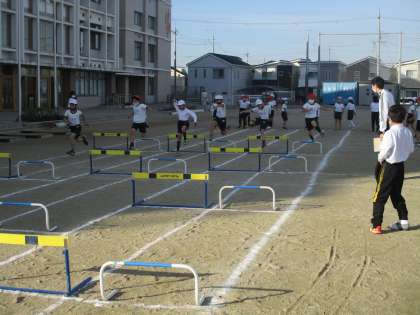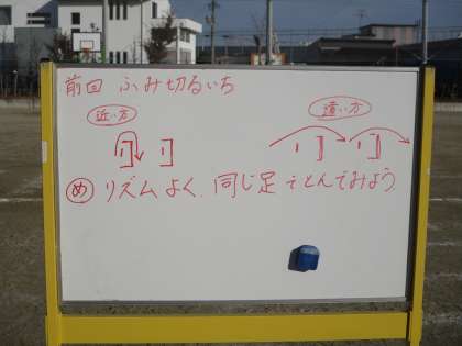 同じ足で踏み切って気持ちよく走れるリズムをつかもうとしています。