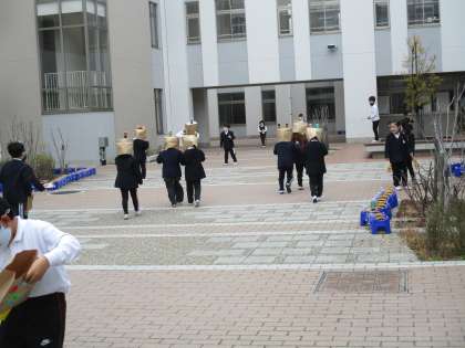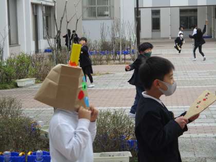 中庭にいる1年生をおどかしています。