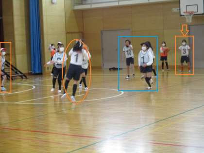 5年2組 体育 バスケットボール 2 公開日 2022/01/25 更新日 2022/01/25 5年 ボールを持っている人(オレンジの○)は,ゴール前にいる↓の人にパスを出したいのですが,相手が間に入っていて(水色の□),パスが通りそうにありません。そこで・・・