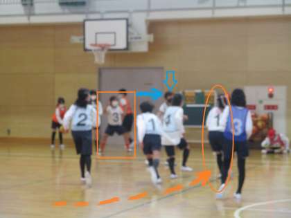 5年2組 体育 バスケットボール 3 公開日 2022/01/25 更新日 2022/01/25 5年 この人は,右サイドにドリブルで進みました。これを止めるために,ゴール下にいた相手が右サイドに出てきます(水色の↓)。すると,ゴール下の味方(オレンジの□)がフリーになりました。