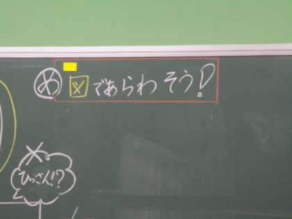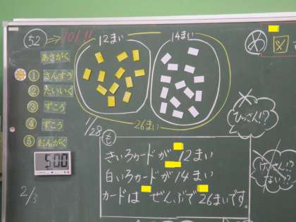 黄色のカード12枚と白のカード14枚で,合わせて何枚になるのか,図に表そうとしています。