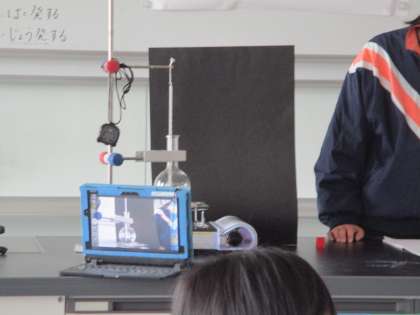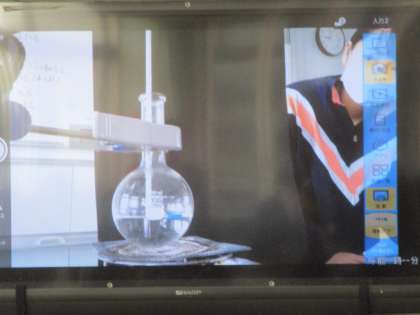 実験の様子がみんなに見えるように,カメラで撮影して大型テレビに映しています。