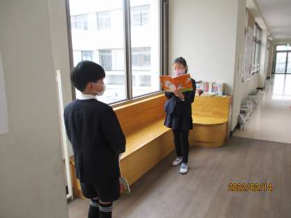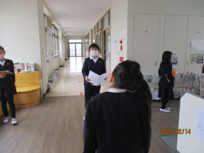 廊下でも,間隔を取りながら練習しています。最初の段階なので,原稿(ノート)を見て話しています。
