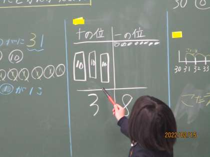 十と一の位に分けて計算する方法を説明しています。みんなの前で考えを説明するのが当たり前になってきました。
