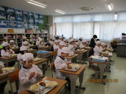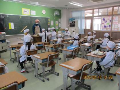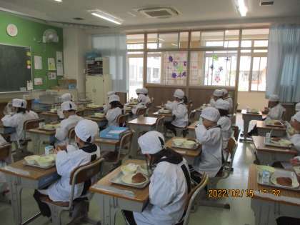 1年生の給食の様子です。静かに整然と準備しています。食べるときはマスクを外すので,黙って食べています。