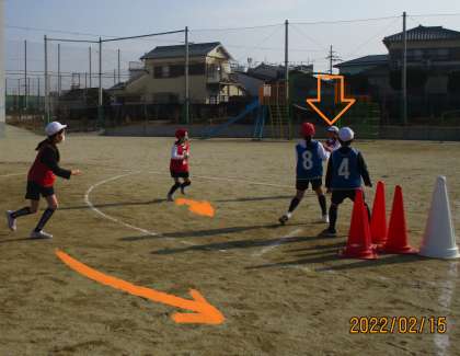 【上の写真】左サイドの味方にパスした人は,自分はゴールの右サイドに走り込もうとしています。もう1人の味方は,ゴールの正面にポジションを取ろうとしています。