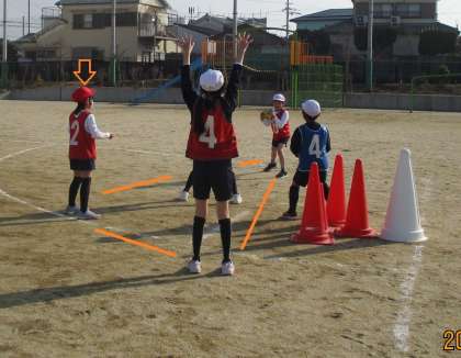 【下の写真】相手ゴールの両サイドを底辺にした三角形をつくって攻撃しています。3人の意図がつながって,連続した攻撃ができてきました。