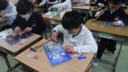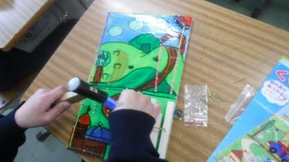 釘を打ち,実際にビー玉をはじきながら作品を作っています。