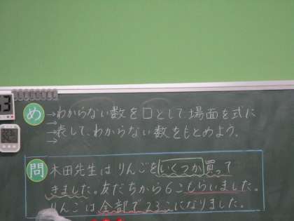 この場面でのわからない数を□で表して立式し,答えを求めていきます。