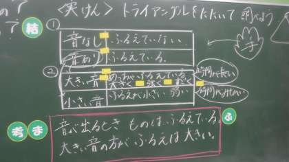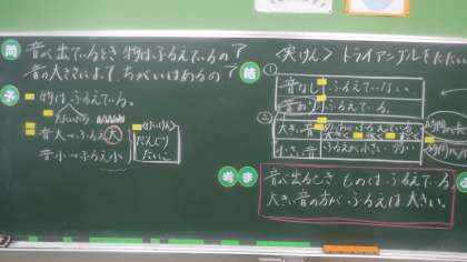 昨日の学習の様子です。音が鳴るときに物はどのようになっているのかを考えています。