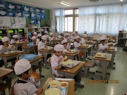 こちらのクラスでは,誕生日の人のために牛乳で乾杯をしていました。しっかり食べて寒さに負けない体をつくりましょう」。