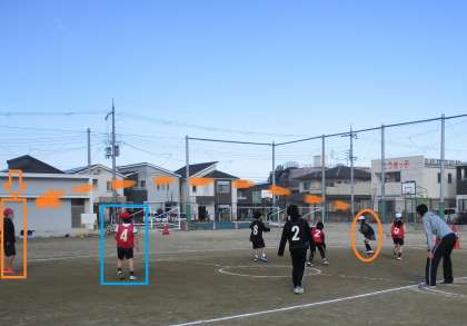 3年ハンドボールの学習が深まってきました。ボールをもっている人(オレンジの○)は,大きくコートを見て,相手ゴールに近いところにいる人(オレンジの↓)にパスしようとしています。これを察知した相手チームの赤の4番の人(水色の□)はマークに動き始めています。