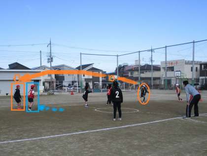 パスが出ました。相手のプレーヤー(赤の4番)はマークに入りました。パスは通るでしょうか。