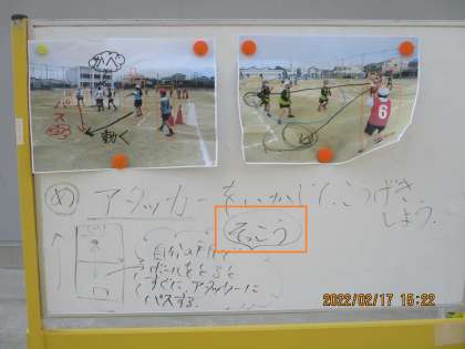 3年1組 体育 ハンドボール 6 公開日 2022/02/18 更新日 2022/02/18 3年 この動きは,この時間のめあてにしていることでした。ゲームの状況を読み取って,最適なプレーを選択していました。学習が深まっています。