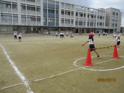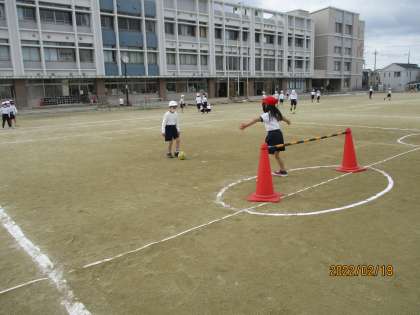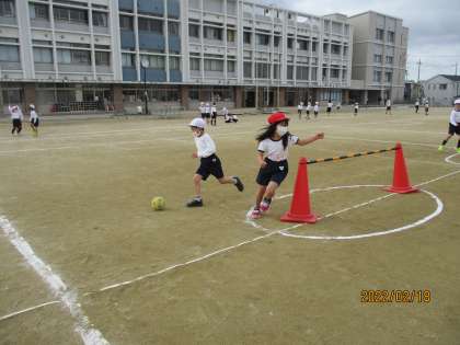 両手を広げて守っています。シュートされるすきま(スペース)を少なくする工夫です。うまくシュートを防ぐことができました。