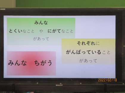 太陽学級の先生による授業です。みんな違う一人一人が知り合い,認め合い,助け合うために大切なことを学んでいます。