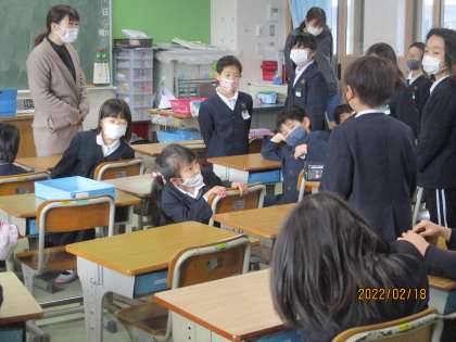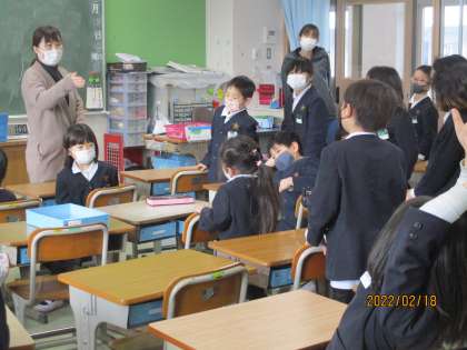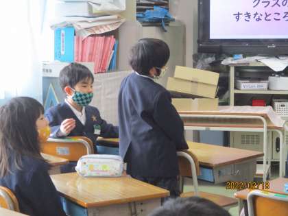 クラスのいいところを発表しています。困ったときに助けてくれる,目標に向かってがんばれる などたくさんいいところが出されました。