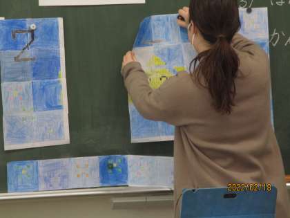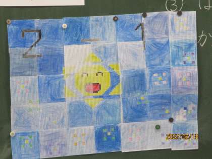 全部貼り合わせると・・・なんと2年1組の「オリジナルモザイク絵」が出来上がりました。塗り方も色の濃さも全然違いますが,それが全部合わさると,すごくあたたかい「作品」ができあがりました。とても大切なことが学べたと思います。