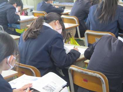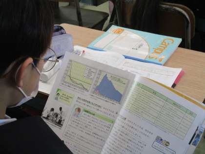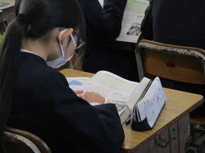 資料を読み取りながら,考えたことや気づいたことをノートに書いています。