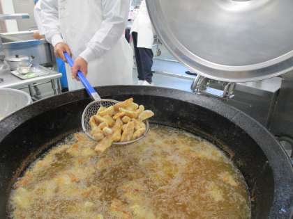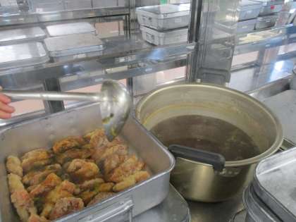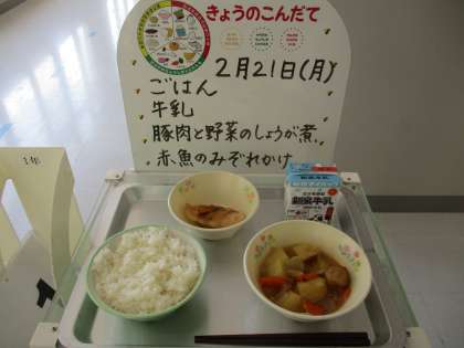 今日の小おかずの魚は、赤魚です。見た目が赤いことからこう呼ばれています。上にかかっているのは大根おろしを使ったたれです。大根おろしに火が通って半透明になった姿がみぞれに似ていることから、みぞれかけという名前が付きました。大根には、でんぷんや油を分解する力があるので、消化を助けてくれます。