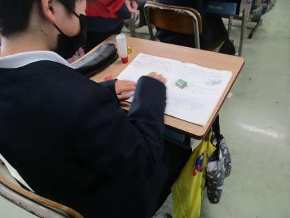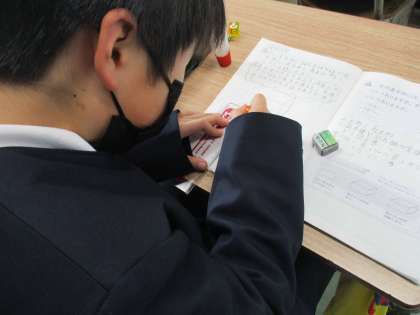 辺の部分は定規を使って直線を引きます。真剣に取り組んでいます。