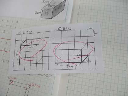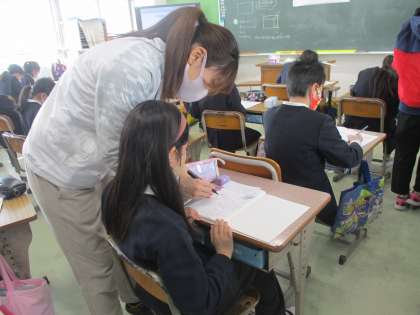 先生が一人一人の作図の様子を見ています。見えない部分は点線でかくこともきちんとできています。