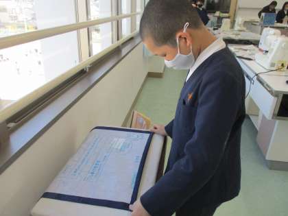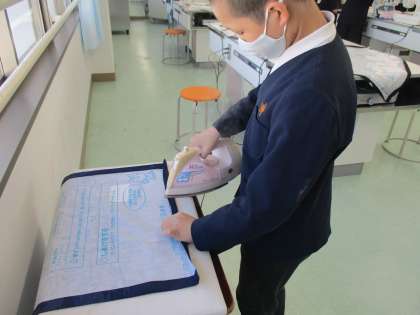 アイロンを使って布に折り目をつけています。このあと,ミシンで縫っていきます。