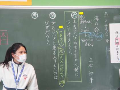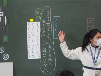 小学校最後の物語教材「海の命」の学習です。主人公の漁師「太一」がなぜ「与吉じいさ」に弟子入りしたのかを考えています。