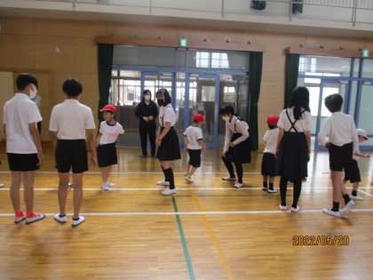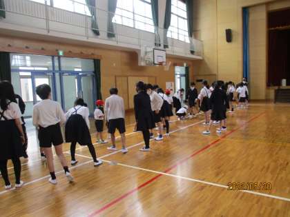こちらは体育館での反復横跳びの計測の様子です。説明と,回数を数えるために6年生が横についています。