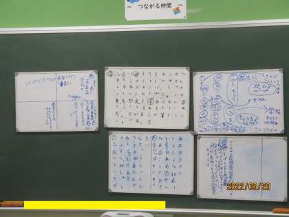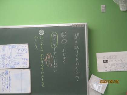 4年 国語 聞き取りメモの工夫 1 公開日 2022/05/20 更新日 2022/05/20 4年 話を聞き取るときのメモの工夫について学んでいます。黒板に掲示しているのは,同じ話を聞いてのメモですが,みんな違っています。