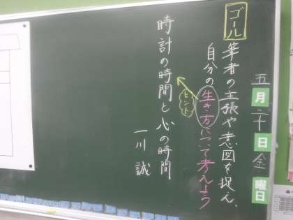 6年2組 国語 説明文の学習 公開日 2022/05/20 更新日 2022/05/20 6年 6年2組,国語の時間の様子です。「時計の時間と心の時間」という説明文の学習です。説明文の学習から,「自分の生き方について考える」という,珍しい取り組みです。 そういう視点で,説明文を読むと,どんなふうに読めるのか,今後の学習が楽しみです。 難しい説明文でも,子どもたちは意欲的に構成を捉えようとしていました。