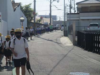 今朝の登校の様子です。すでに暑くなっています。