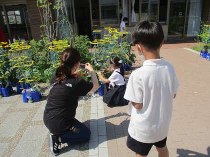 2年生が生活科で野菜を育てていますが,早くもキュウリが収穫できる状態になった人がいました。