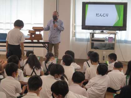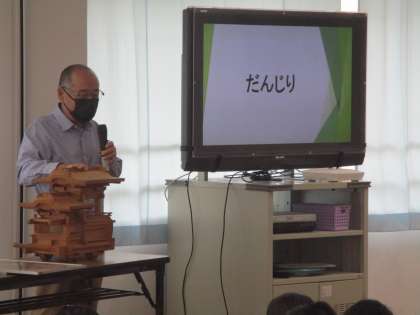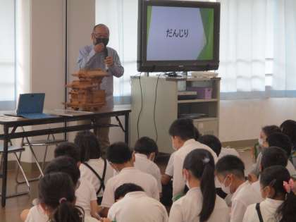 東陶器の地域について調べている3年総合の学習です。だんじりについて,地域の方にお話を聞いています。