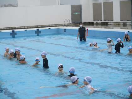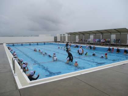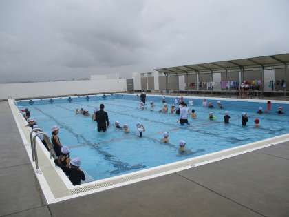 1年体育の水泳の学習の様子です。先週と違って,くもり空ですが,気温・水温ともコンディションは良好です。
