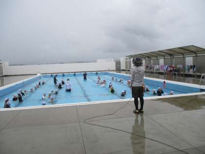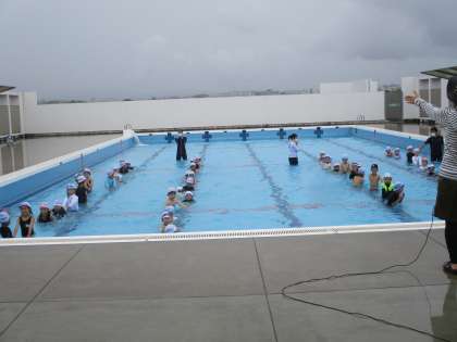 プールの底のラインに沿って整列しています。指示もよく聞いています。