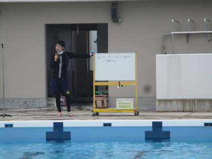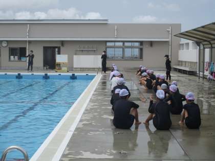 5年生の水泳の学習です。休憩が終わり,この後,息つぎをしながら長い距離を泳ぐ技をみにつけていきます。