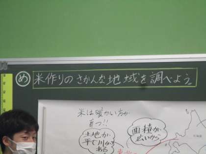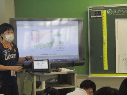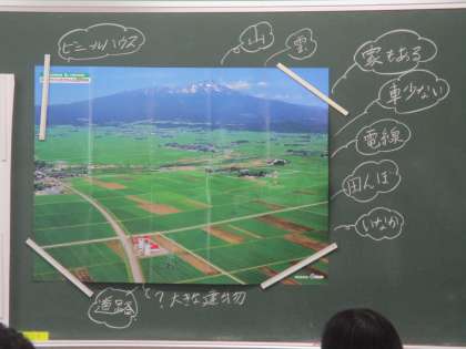 山形県の庄内平野の写真などを資料に,米作りのさかんな地域について学習しています。