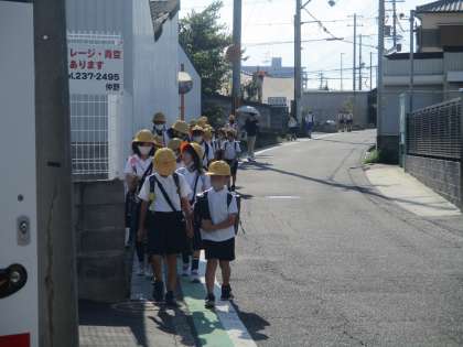 今朝の登校の様子です。今朝も朝から暑くなっています。6年生が校外学習なので,早めに登校しているようです。