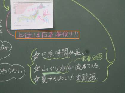 5年3組 社会 米作りのさかんな地域 2 公開日 2022/07/07 更新日 2022/07/07 5年 夏場の日照時間の長いのが日本海側で,生産量上位も日本海側であることから,日照時間を米作りの大切な条件だと考えました。