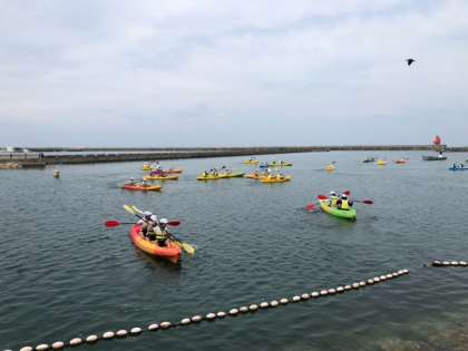 カヌーが海に出て行きます。『みーぎ、ひだり!』友だちと息を合わせて、漕ぎ進めます!
